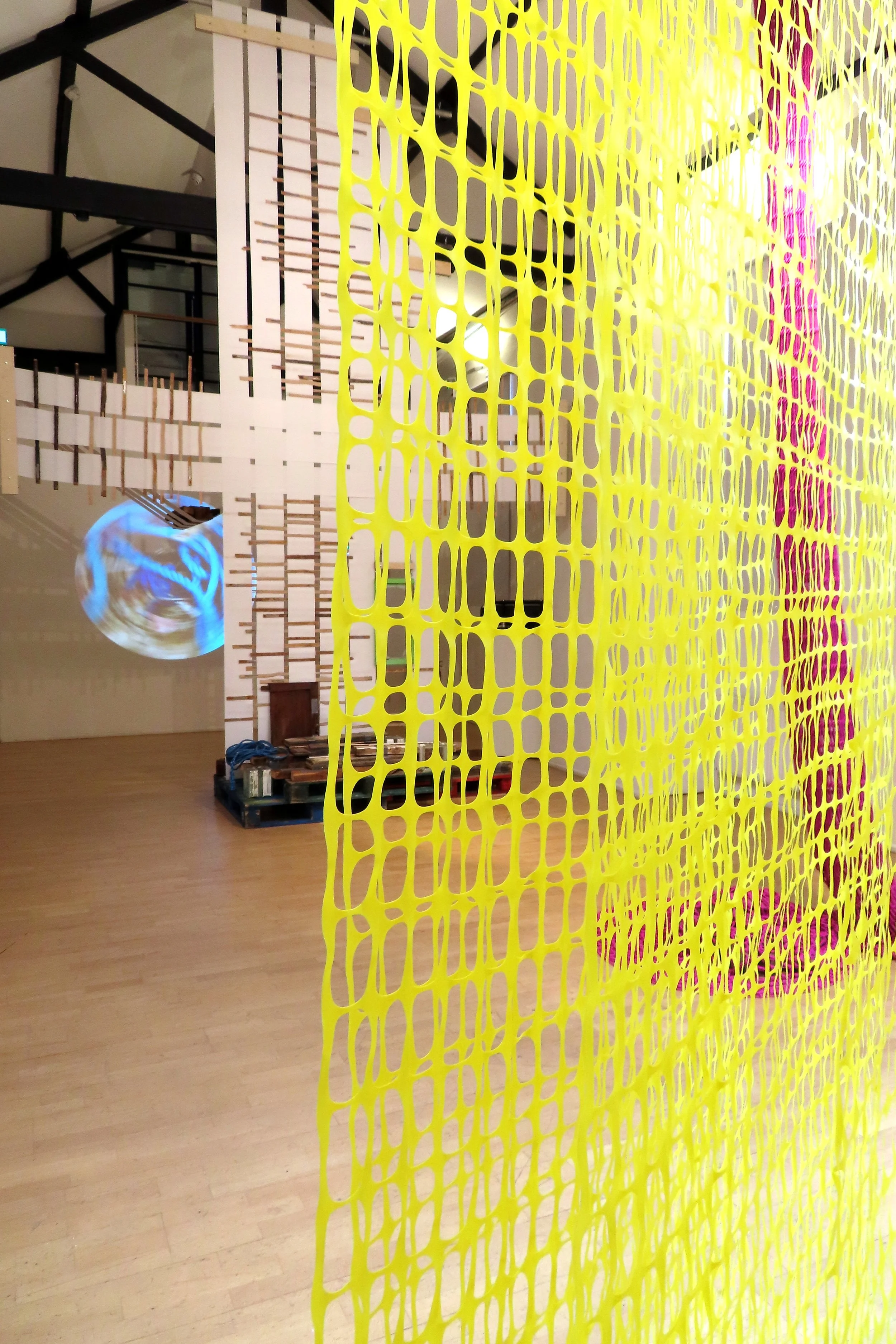 Limbo consists of eleven sheets of yellow plastic safety mesh, suspended in a grid format to create a hanging sculpture. Limbo is a term often associated with an intermediate state or transitional situation characterized by uncertainty - an in-between, suspended state. Conceived during the Covid lockdown, the safety mesh recalls the temporary barriers that were imposed upon us all during this period describing the oppositional states of containment versus the protection afforded by the confinement to our homes. The yellow is a symbol of hope and sunlight.